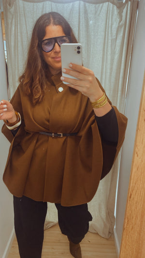 Capa de paño de corte over size. con botones en la parte delantera y cinturón a juego.