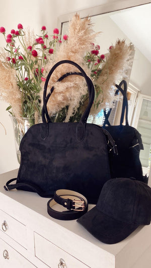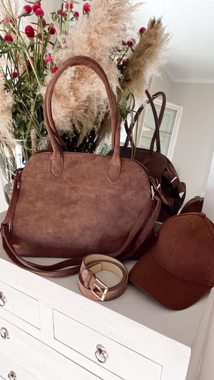 Bolso de efecto antelina, con cremallera y forrado en su interior. Con asa media para colgar y otra regulable.