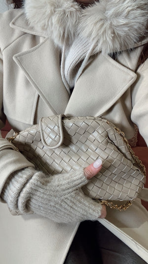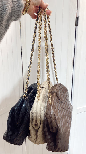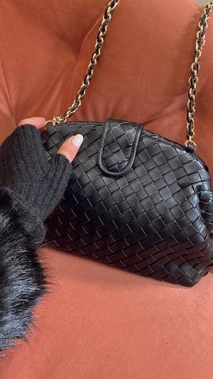 Bolso cluth trenzado , forrado todo su interior y con bolsillo . Tiene una cadena larga para poder poner y quitar...
