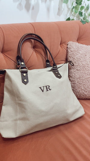 Bolso de lona de alta calidad con asas de piel y correa regulable de algodón, ideal para llevar cruzado. Posibilidad de personalizar con iniciales bordadas.