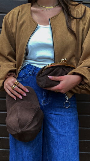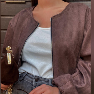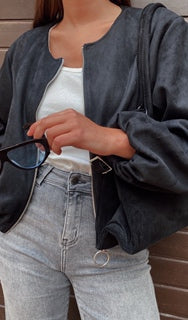Bomber de tejido de eco piel, de color gris con efecto desgastado, con goma en los puños y en la parte inferior de la cintura y cuello y forrada todo su interior.