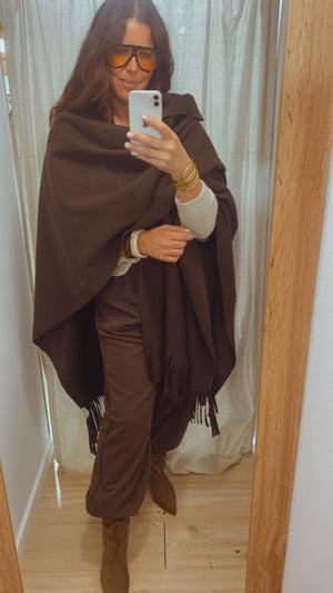 Capa de paño de corte over size con flecos en la parte inferior.