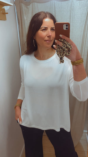 Jersey fluido de manga larga y cuello redondo. Ideal para combinar con unos vaqueros o un pantalón de vestir. Talla única, alcanza hasta una 44.