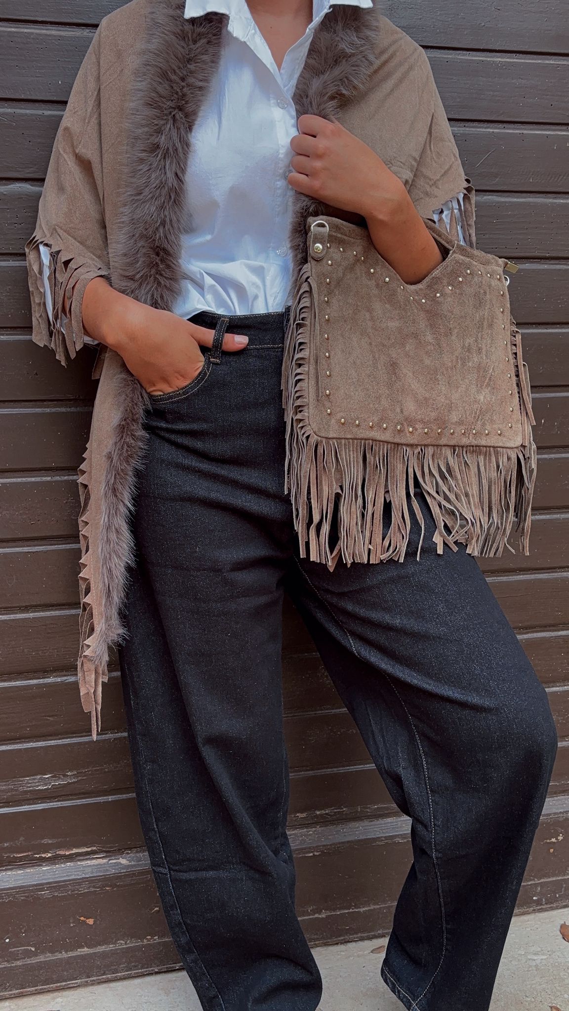 Poncho de eco piel, con pelo sintético y flecos. Ideal para Completar y elevar tus looks.