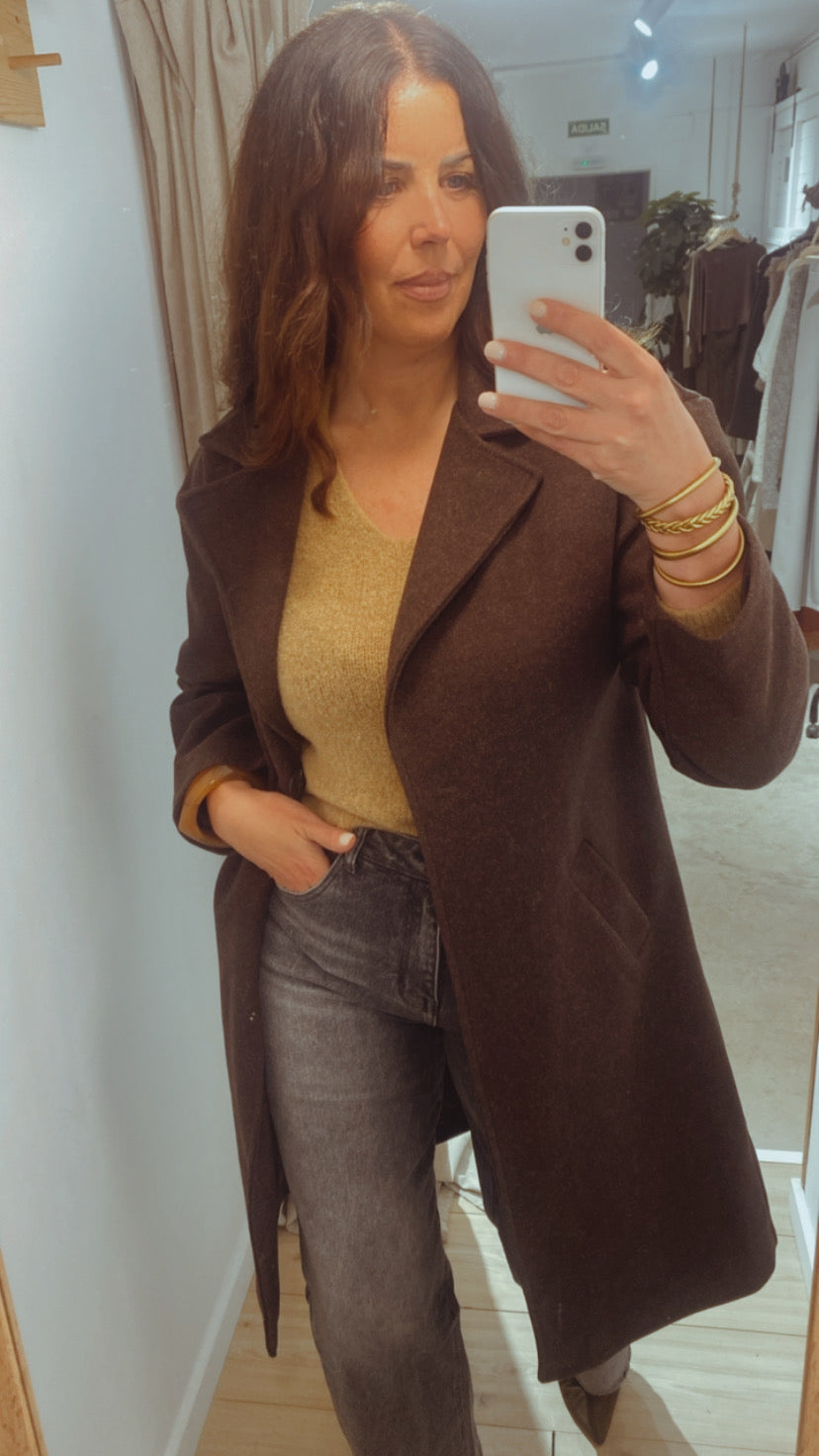 Abrigo de paño de color marrón chocolate , de corte recto con solapa , doble bolsillo lateral y forrado todo su interior.