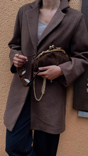 Bolso de piel de serraje , forrado todo su interior y con asa larga de cadena dorada para llevar cruzado o de lado.