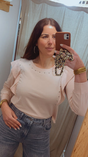 Camiseta de manga larga, cuello redondo, volantes en los hombros y tachuelas decortaivas. De algodón, ideal para la primavera. Talla única, alcanza hasta una 44.