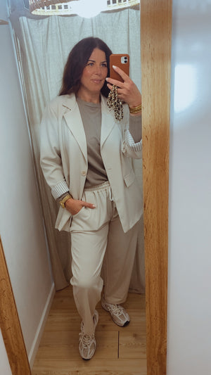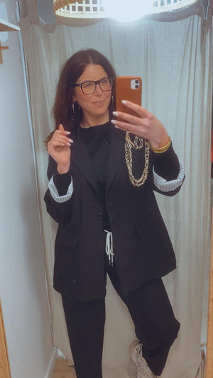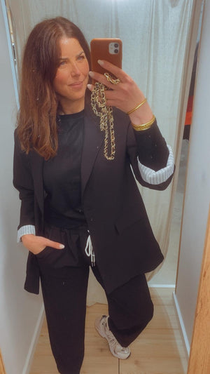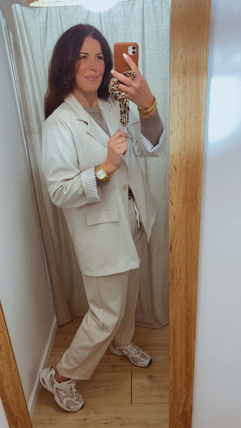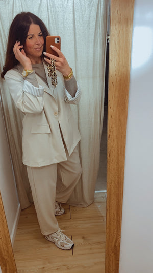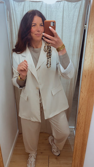 Conjunto de 2 piezas compuesto por pantalón largo con goma en la cintura y doble bolsillo y blazer de manga larga, cuello solapa, abotonado en la parte delantera y doble bolsillo decorativo. Ambas piezas forradas en su interior.