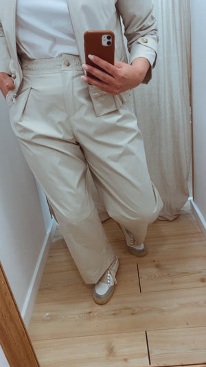 Pantalón de pinzas , con goma en la cintura y doble bolsillo lateral .