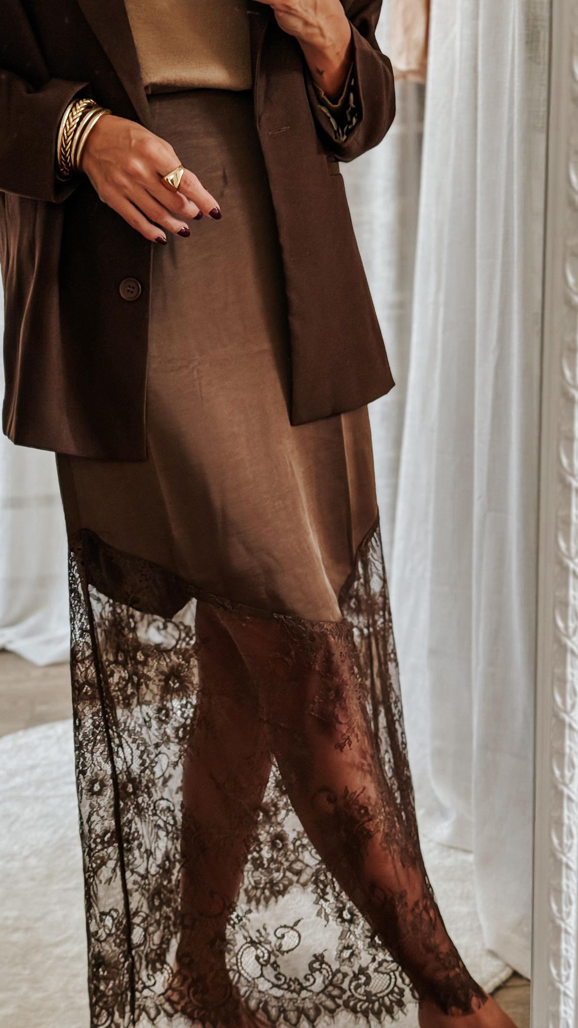 Falda satén Y blonda Paola Falda de tejido de satén y rubia, de corte recto con cremallera en la cintura. Una...