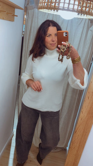 Jersey con mucho estilo. De corte recto, cuello chimenea, manga 3/4 acabadas con pelito sintético de una calidad alta. Muy suave, ideal para estas fiestas.