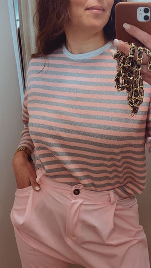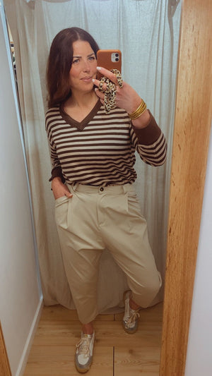 Pantalón largo fludo de corte Baggy, abotonado y presillas en la parte del cinturón. Ideal para combinar con jersey finito y llevarlo por dentro. Talla única, alcanza hasta una 44.