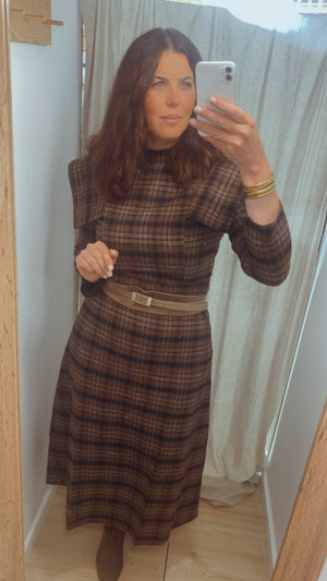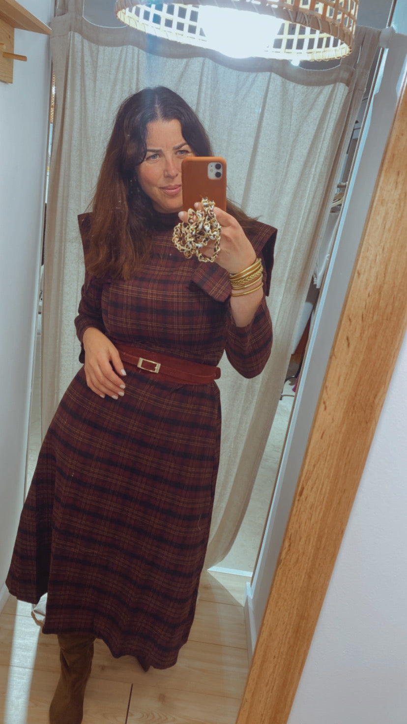 Vestido de tejido de paño fino , de estampado de tartán en tonos marrónes, beige y negro .
