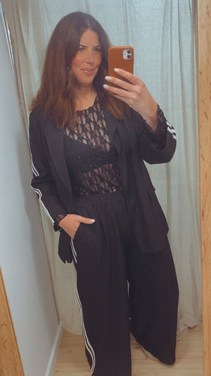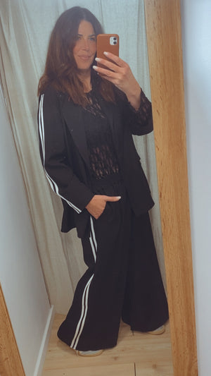 Conjunto de 3 piezas compuesto por Blazer de corte clásico, abotonado en la parte delantera, pantalón de corte over size, muy cómodo para la primavera y top de blosa semi transparente. Ideal para llevar en conjunto. Talla única, alcanza hasta una 44.