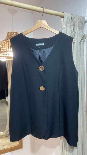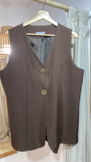 Chaleco de corte masculino, forrado en su interior, manga sisa y escote en pico. 2 botones dorados en la parte delantera. Una prenda muy top a un precio inmejorable. Última unidad.