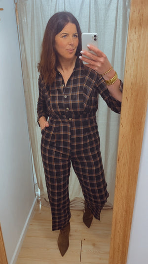 mono de tejido de paño fino con estampado de tartán .Tiene cierre de botones en la parte delantera , goma en la parte trasera de la cintura y doble bolsillo laterales.
